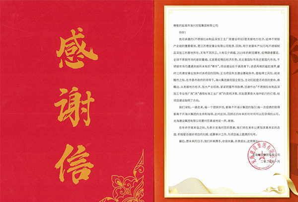 灌東投資公司拉絲廠房項(xiàng)目組收到來自承建單位龍海建設(shè)集團(tuán)的感謝信。2025-02-09