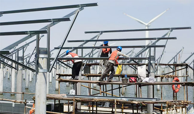 黃海新區(qū)響水片區(qū),6萬余根管樁如鋼鐵森林般矗立在碧波之中。興悅新能源420MW漁光互補發(fā)電項目現(xiàn)場呈現(xiàn)一片繁忙有序的景象,頭戴安全帽、身著工作服的工人們,如同靈動的音符,穿梭在一根根排列密集的工程樁之間,全神貫注地進行著光伏支架和組件的安裝。2025-09-17 -