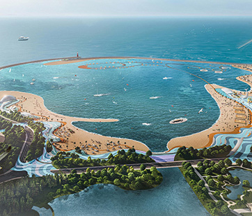 該項(xiàng)目位于月亮灣旅游度假區(qū)海堤外側(cè),以海濱文體旅游綜合體為定位,以2012年四條鯨魚擱淺新灘鹽場附近事件為引,結(jié)合古黃河文化和海洋文化,構(gòu)建以“鯨魚沙灘”為主題的IP。